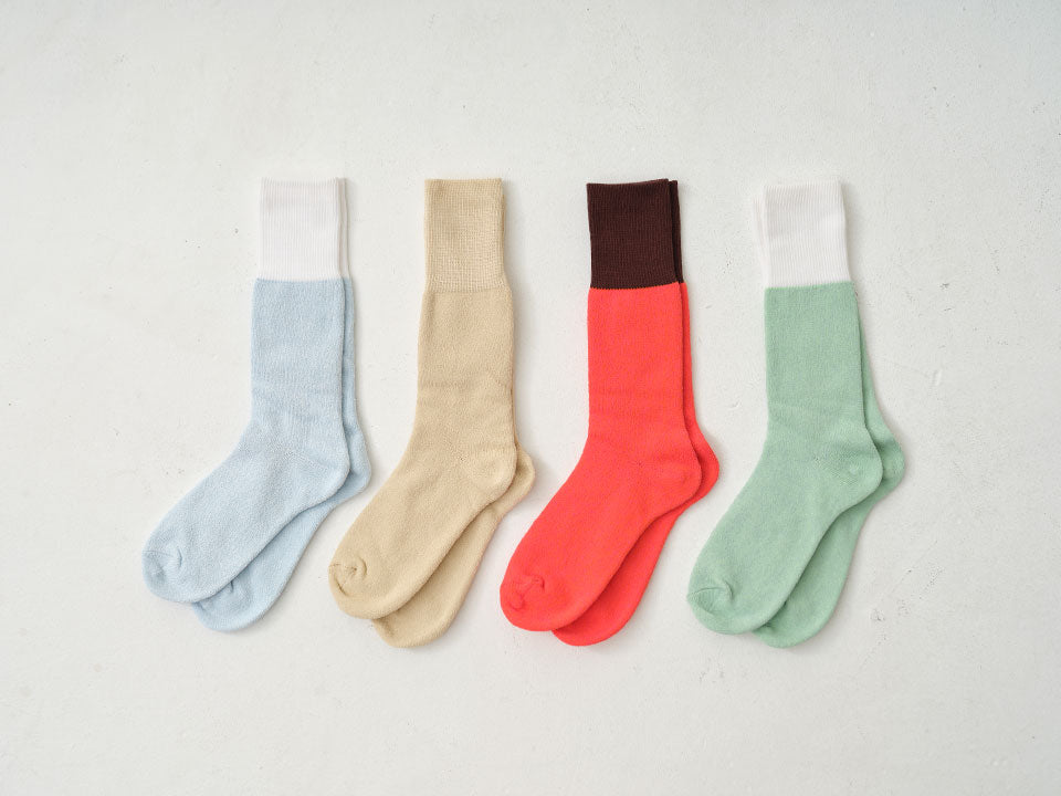 Featuring a comfortable middle-gauge pile, these socks are finished in the vibrant, signature colors of Hoisum. The cuff is crafted from lustrous cotton, while the interior loops are knit with our specialized Asamerry Yarn for a crisp, breathable feel against the skin.