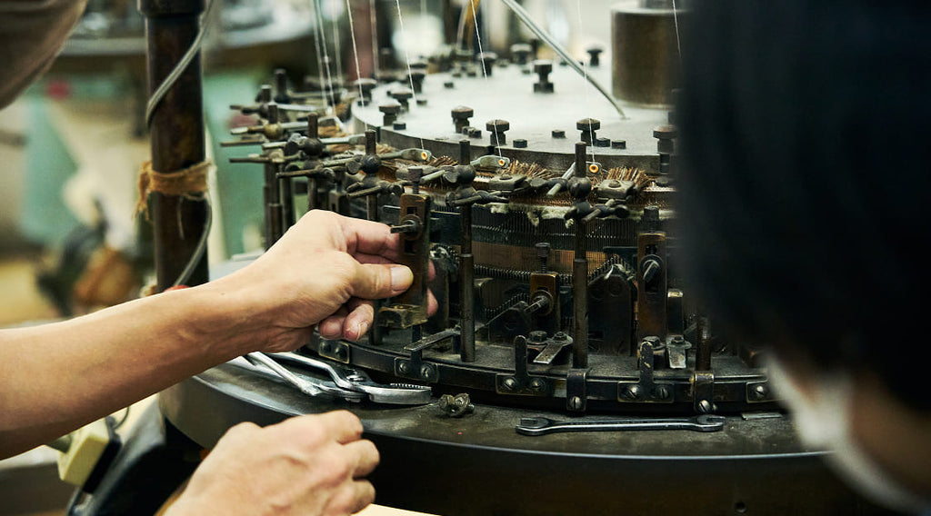 上針と下針の2段ある編機を使用し、双方の針で天竺地を編みながら、一定の間隔で上針の編ループと下針のループを交差させロックする。