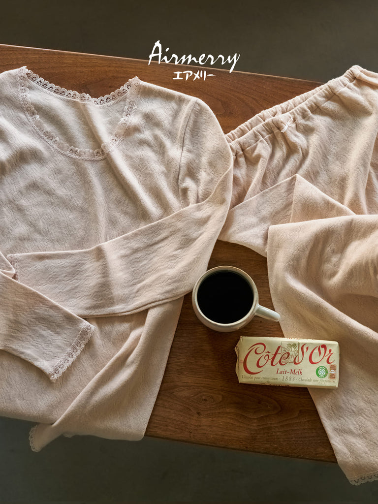 エアメリーの生地は、2枚の生地が一つに繋がった袋編という特殊な編地。生地の断面にストロー状の空気層が並び、この空気層が体温で温められた空気を閉じ込め、またふんわりとした風合いの生地になります。