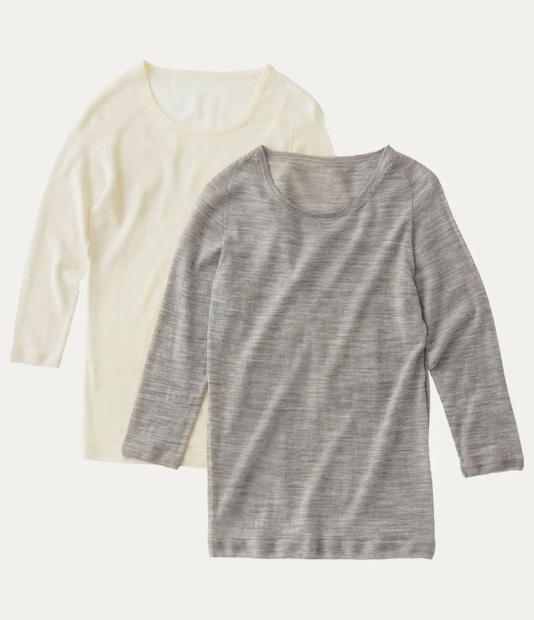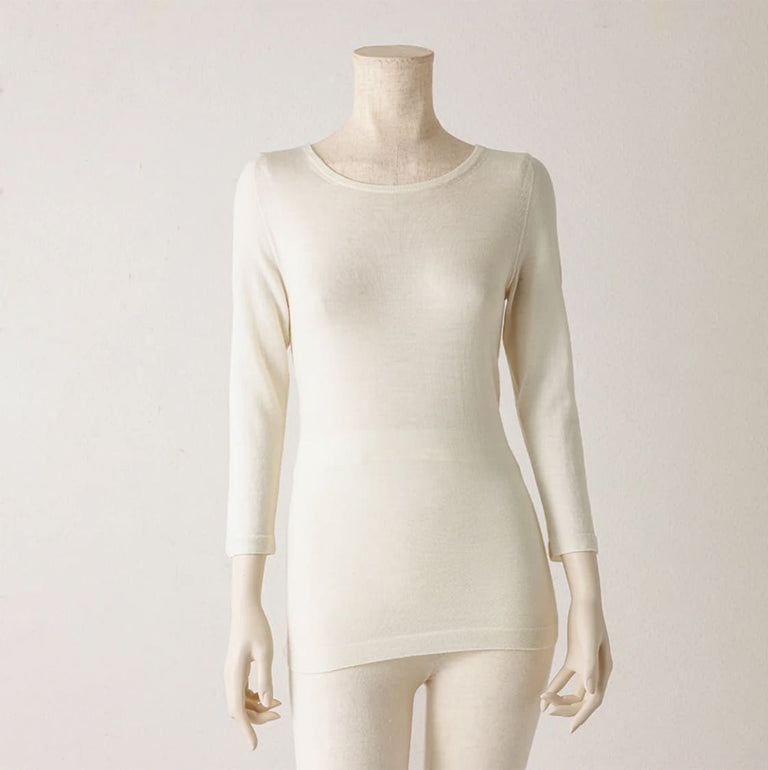 トップスのこだわりは、衿ぐりのリンキング付け。編み目を一つずつ繋ぐことでごろつきにくくなります。縫い目がないため、アウターにもひびきにくくなっています。また、ラグランスリーブのデザインを取り入れることで肩や腕を動かしやすく、フィット感もアップ。